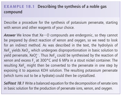 The perxenates of several alkali metal ions have been prepared by treatment of XeO3 with ozone in basic conditions. These compounds are white crystalline solids with octahedral XeO6 4 units (12). They are powerful oxidizing agents in acidic aqueous solution: