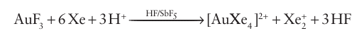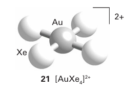 Key points: Argon, xenon, and krypton form coordination compounds that are usually studied by matrix isolation; the stability of the complex es decreases in the order Xe Kr Ar. Coordination compounds of noble gases have been known since the mid-1970s. The first stable noble-gas coordination com pound to be synthesized was [AuXe4]+2 [SbF11]-2, which contains a square-planar [AuXe4]+2 cation (21). The compound is made by reduction of AuF3 by HF/SbF5 in elemental xenon to yield dark red crystals that are stable up to 78°C. Alternatively, addition of Xe to a solution of Au2 in HF/SbF5 gives a dark red solution that is stable up to 40°C. This solution is stable at room temperature under a xenon pressure of 1 MPa (about 10 atm). During the reduction of Au3 to Au2 the extreme Brønsted acidity of HF/SbF5 (Section 15.11) is essential and the overall reaction indicates the role of protons:
