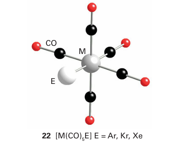 Many complexes of the noble gases are transient species that have been characterized by matrix isolation. The complex Fe (CO)4 Xe is formed when Fe(CO)5 is photolysed in solid xenon at 12 K. Similarly, M(CO)5 E is formed when M(CO)6 (M Cr, Mo, or W) is photolysed in solid argon, krypton, or xenon at 20 K, where E=Ar, Kr, or Xe, respectively. An alternative method of synthesizing these complexes is to generate them in an argon, krypton, or xenon atmosphere. The Xe complex has also been isolated in liquid xenon. The stabilities of the complexes decrease in the order W>Mo ≈ Cr and Xe>Kr>Ar. The complexes are octahedral (22) and the bonding is thought to involve inter actions between the p orbitals on the noble gas and orbitals on the equatorial CO groups. Thus, noble gases can be thought of as potential ligands, and indeed have been fully characterized as such (including by NMR; Section 22.16).