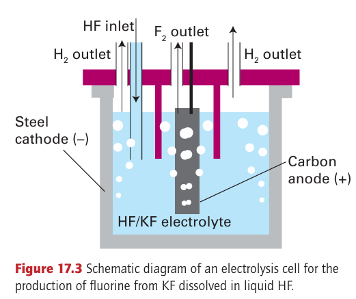 Key points: Fluorine, chlorine, and bromine are prepared by electrochemical oxidation of halide salts; chlorine is used to oxidize Br and I to the corresponding dihalogen. All the dihalogens (except the radioactive At2) are produced com mercially on a large scale, with chlorine production by far the greatest, followed by fluorine. The principal method of production of the elements is by electrolysis of the halides (Section 5.18). The strongly positive standard potentials EO (F2, F) =2.87 V and EO (Cl2, Cl) 1.36 V indicate that the oxidation of F and Cl ions requires a strong oxidizing agent. Only electro lytic oxidation is commercially feasible. An aqueous electrolyte cannot be used for fluorine production because water is oxidized at a much lower potential (+1.23 V) and any fluorine produced would react rapidly with water. The isolation of elemental fluorine is achieved by electrolysis of a 1:2 mixture of molten KF and HF in a cell like that shown in Fig. 17.3. It is important to keep fluorine and the byproduct, hydrogen, separate because they react violently. Most commercial chlorine is produced by the electrolysis of aqueous sodium chloride solution in a chloralkali cell (Fig. 17.4). The half-reactions are