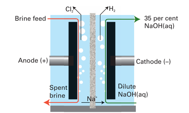 Figure 17.4 Schematic diagram of a chloralkali cell using a cation transport membrane, which has high permeability to Na ions and low permeability to OH- and Cl- ions.