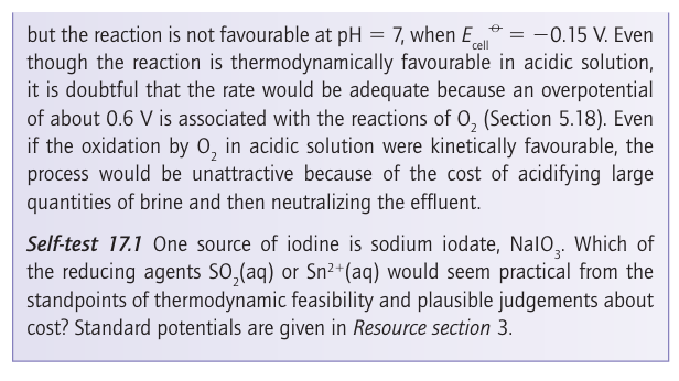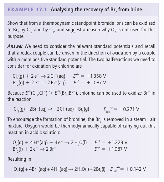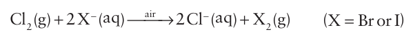 Bromine is obtained by the chemical oxidation of Br ions in seawater. A similar process is used to recover iodine from certain natural brines that are rich in I-. The more strongly oxidizing halogen, chlorine, is used as the oxidizing agent in both processes, and the resulting Br2 and I2 are driven from the solution in a stream of air: