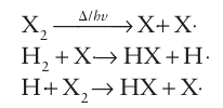 All the Group 17 elements undergo thermal or photochemical dissociation in the gas phase to form radicals. These radicals take part in chain reactions, such as: