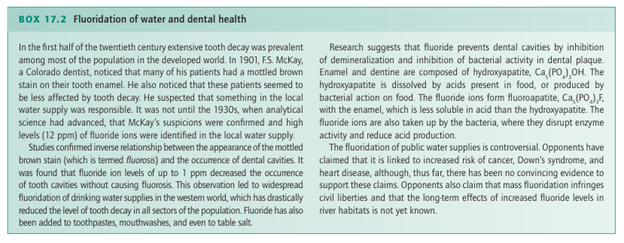 A reaction of this type between chlorine and methane is used in the industrial synthesis of chloroform, CH3 Cl, and dichloro methane, CH2Cl2 . Compounds of F are used throughout industry. Fluorine as F ions is added to some domestic water supplies and toothpaste to prevent tooth decay (Box 17.2). It is used as UF6 in the nuclear power industry for the separation of the isotopes of uranium. Hydrogen fluoride is used to etch glass and as a nonaqueous solvent. Chlorine is widely used in industry to make chlorinated hydrocarbons and in applications in which a strong oxidizing agent is needed, including disinfectants and bleaches. These applications are in decline, however, because some organic Cl compounds are carcinogenic and chlorofluorocarbons (CFCs) are implicated in the destruction of ozone in the stratosphere (Box 17.3). Hydrofluorocarbons (HFCs) are now replacing CFCs in applications such as refrigeration and air conditioning. Organobromine compounds are used in synthetic organic chemistry: the C Br bond is not as strong as the CCl bond and Br can be more readily displaced (and recycled). Iodine is an essential element and iodine deficiency is a cause of goitre, the enlargement of the thyroid gland. For this reason, small amounts of potassium iodide are added to table salt.
