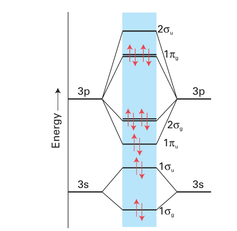 Figure 17.5 Schematic molecular orbital energy level diagram for Cl2 (similarly Br2 and I2). For F2 the order of the u and upper g orbitals is reversed.