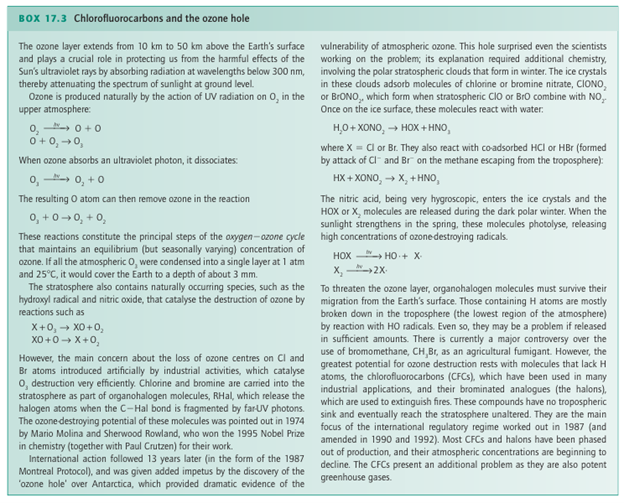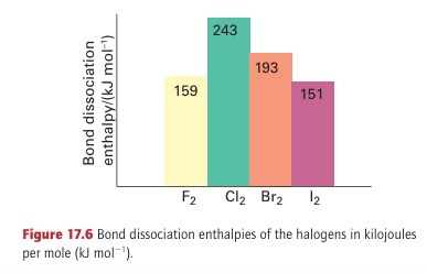 Key points: The F-F bond is weak relative to the Cl-Cl bond; bond strengths decrease down the group from chlorine. Among the most striking physical properties of the halogens are their colours. In the vapour they range from the almost colour less F2, through yellow–green Cl2 and red–brown Br2, to purple I2. The progression of the maximum absorption to longer wavelengths reflects the decrease in the HOMO–LUMO gap on descending the group. In each case, the optical absorption spectrum arises primarily from transitions in which an electron is promoted from the highest filled 2Ϭg and 1 g orbitals into the vacant antibonding 2Ϭu orbital (Fig. 17.5). Except for F2, the analysis of the UV absorption spectra gives precise values for the dihalogen bond dissociation energies (Fig. 17.6). It is found that bond strengths decrease down the group from Cl2. The UV spectrum of F2, however, is a broad