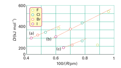 Figure 17.7 Dissociation enthalpies of (a) carbon halogen, (b) hydrogen halogen, and (c) halogen-halogen bonds plotted against the reciprocal of the bond length.