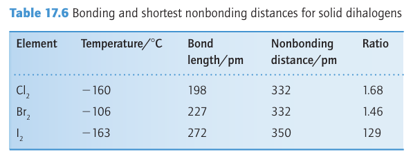 Figure 17.8 Solid chlorine, bromine, and iodine have similar structures. The closest nonbonded interactions are relatively less compressed in Cl2 and Br2 than in I2.