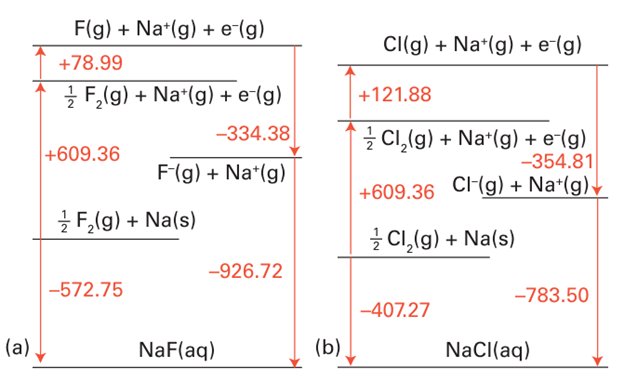 Figure 17.10 Thermochemical cycles for the enthalpy of formation of (a) aqueous sodium fluoride and (b) aqueous sodium chloride. The hydration is much more exothermic for F than for Cl-. All values are in kilojoules per mole (kJ mol1-).