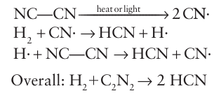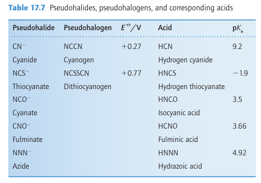 A number of compounds have properties so similar to those of the halogens that they are called pseudohalogens (Table 17.7). For example, like the dihalogens, cyanogen, (CN)2, undergoes thermal and photochemical dissociation in the gas phase; the resulting CN radicals are isolobal with halogen atoms and undergo similar reactions, such as a chain reaction with hydrogen: