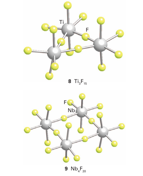 As the oxidation number of the metal atom increases, the halides become more covalent. Thus, all metal hexahalides such as MoF6 and WCl6, are molecular covalent compounds. For inter mediate oxidation states (such as MF4 and MF5) the structures normally consist of linked MF6 polyhedra. Titanium tetrafluoride has a structure based on columns of triangular Ti3 F15 units formed from three TiF6 octahedra (8) whereas NbF5 is built from four NbF6 octahedra forming a square unit of composition Nb4F20 (9).
