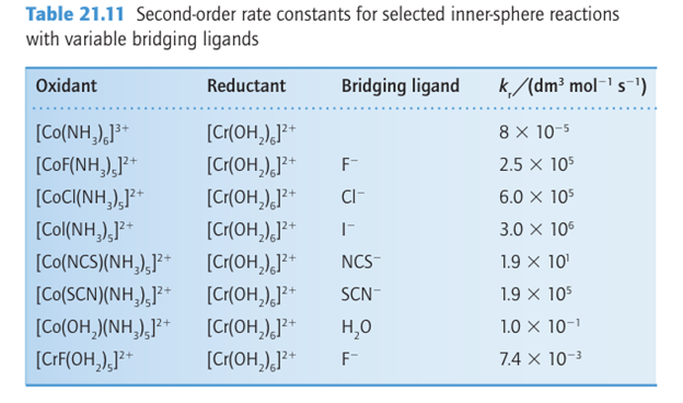 by [Cr (OH2 )6 ]2, in which the rate-determining step is the dissociation of the Cl-bridged complex [RuII (NH3)5 (μ-Cl) CrIII (OH2)5]4+. Reactions in which the formation of the bridged complex is rate determining tend to have similar rate constants for a series of partners of a given species. For example, the oxidation of V2 (aq) has similar rate constants for a long series of Co (III) oxidants with different bridging ligands. The explanation is that the rate determining step is the substitution of an H2 O molecule from the coordination sphere of V(II), which is quite slow (Table 21.8).