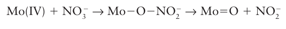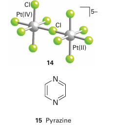 which occurs through a Cl bridge (14). The reaction depends on the transfer of a Cl-ion in the break-up of the successor complex. There is no difficulty in assigning an inner-sphere mechanism when the reaction involves ligand transfer from an initially nonlabile reactant to a nonlabile product. With more labile complexes, inner-sphere reactions should always be suspected when ligand transfer occurs as well as electron transfer, and if good bridging groups such as Cl-, Br-, I-, N3-, CN-, SCN-, pyrazine (15), 4,4-bipyridine (16), and 4-dimethylaminopyridine (17) are present. Although all these ligands have lone pairs to form the bridge, this may not be an essential requirement. For instance, just as the carbon atom of a methyl group can act as a bridge between OH and I in the hydrolysis of iodomethane, so it can act as a bridge between Cr (II) and Co (III) in the reduction of methyl cobalt species by Cr (II). The oxidation of a metal centre by oxidoanions is also an example of an inner-sphere process. For example, in the oxidation of Mo (IV) by NO3 ions, an O atom of the nitrate ion binds to the Mo atom, facilitating the electron transfer from Mo to N, and then remains bound to the Mo (VI) product: