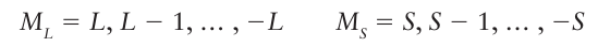 These quantum numbers give the orientation of the angular momentum relative to an arbitrary axis: there are 2L+1 values of ML for a given value of L and 2S+1 values of MS for a given value of S. The values of ML and MS for a given microstate can be found very easily by adding together the values of ml or ms for the individual electrons. Therefore, if one electron has the quantum number ml1 and the other has ml2 , then ML=ml1+ml2