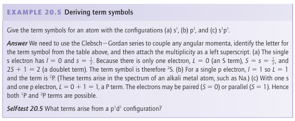 Key points: Different microstates exist for the same electronic configuration; for light atoms, Russell Saunders coupling is used to describe the terms, which are specified by symbols in which the value of L is indicated by one of the letters S, P, D,..., and the value of 2S+1 is given as a left superscript.