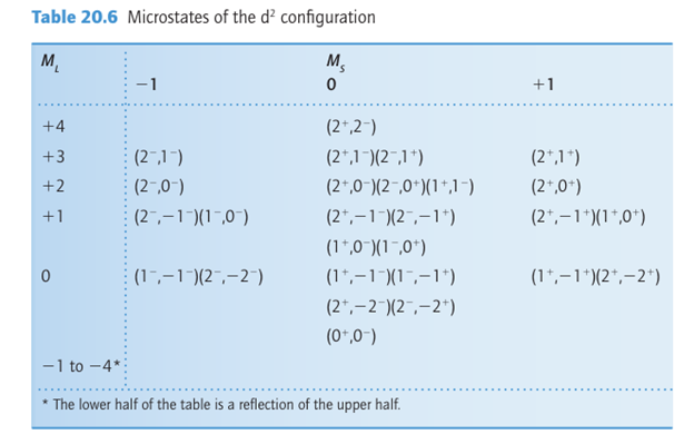 There is one unassigned microstate in the row with ML=+2 (which must arise from L=2) and the column under MS=0 (S=0), which must therefore belong to a 1D term. This term has five values of ML, which removes one microstate from each row in the column headed MS 0 down to ML=-2, leaving 10 microstates unassigned. Because these unassigned microstates include one with ML=+1 and MS=+1, nine of these microstates must belong to a 3P term. There now remains only one microstate in the central box of the table, with ML=0 and MS=0. This microstate must be the one and only state of a 1S term (which has L=0 and S=0).