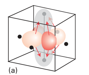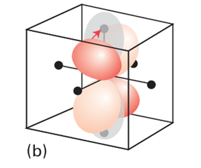 Figure 20.24 The shifts in electron density that accompany the two transitions discussed in the text. There is a considerable relocation of electron density towards the ligands on the z-axis in (a), but a much less substantial relocation in (b).
