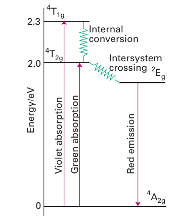 Figure 20.35 The transitions responsible for the absorption and luminescence of Cr3+ ions in ruby.