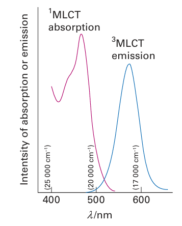 These absorptions occur in the green and violet regions of the spectrum and are responsible for the red colour of the gem (Fig. 20.35). Intersystem crossing to a 2E term of the t2g3 configuration occurs in a few picoseconds or less, and red 627 nm phosphorescence occurs as this doublet decays back into the quartet ground state. This red emission adds to the red perceived by the subtraction of green and violet light from white light, and adds lustre to the gem’s appearance. This effect was utilised in the first laser to be constructed (in 1960). A similar 2E → 4A phosphorescence can be observed from a number of Cr (III) complexes in solution. The 2E term arises from the t2g 3 configuration, which is the same as the ground state, and thus the strength of the ligand field is not important. Hence the emission is always in the red (and close to the wavelength of ruby emission). If the ligands are rigid, as in [Cr(bpy)3] +3, the 2E term may live for several microseconds in solution. Another interesting example of a phosphorescent state is found in [Ru(bpy)3]2+. The excited singlet term produced by a spin-allowed MLCT transition of this d6 complex under goes intersystem crossing to the lower energy triplet term of the same configuration, t2g 5π*1. Bright orange emission then occurs with a lifetime of about 1 s (Fig. 20.36). The effects of other molecules (quenchers) on the lifetime of the emission may be used to monitor the rate of electron transfer from the excited state.
