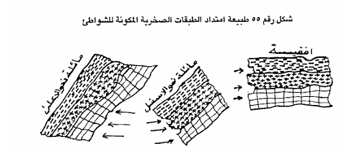 4- صلابة تكوينات الشواطئ ومدى مقاومتها لعمليات التعرية، فإذا كانت صخوراً نارية تكون كتلية قليلة المفاصل لذا يكون تأثير التعرية عليها محدود أما إذا كانت صخوراً رسوبية طبقية فيكون التأثير فيها كبيراً، ويتوقف ذلك على طبيعة امتدادها فإذا كان أفقياً يكون التأثير كبيراً وإذا كانت مائلة نحو الأسفل باتجاه المياه يكون التأثير عليها بدرجة أقل من الأولى أما إذا كان الميل نحو اليابس فيكون التأثير أقل من النوعين السابقين ، وقد يكون الشاطئ عبارة عن تكونات هشة فيكون التأثير فيها كبيراً أو يتراجع الساحل نحو اليابس بشكل واضح.