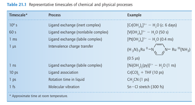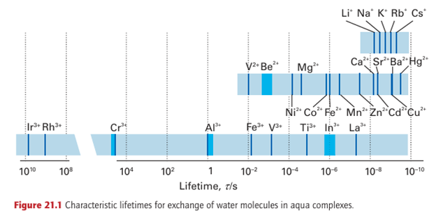 Rates of reaction are as important as equilibria in coordination chemistry. The numerous isomers of the ammines of Co (III) and Pt (II), which were so important to the development of the subject, could not have been isolated if ligand substitutions and interconversion of the isomers had been fast. But what determines whether one complex will survive for long periods whereas another will undergo rapid reaction? The rate at which one complex converts into another is governed by the height of the activation energy barrier that lies between them. Thermodynamically unstable complexes that survive for long periods (by convention, at least a minute) are commonly called ‘inert’, but nonlabile is more appropriate and is the term we shall use. Complexes that undergo more rapid equilibration are called labile. An example of each type is the labile complex [Ni (OH2)6]2+, which has a half-life of the order of milliseconds before the H2O is replaced by another H2 O or a stronger base, and the nonlabile complex [Co (NH3)5 (OH2)]3, in which H2O survives for several minutes as a ligand before it is replaced by a stronger base. Figure 21.1 shows the characteristic lifetimes of the important aqua metal ion complexes. We see a range of lifetimes starting at about 1 ns, which is approximately the time it takes for a molecule to diffuse one molecular diameter in solution. At the other end of the scale are lifetimes in years. Even so, the illustration does not show the longest times that could be considered, which are comparable to geological eras. We shall examine the lability of complexes in greater detail when we discuss the mechanism of reactions later in this section, but we can make two broad generalizations now. The first is that complexes of metals that have no additional factor to provide extra stability (for instance, the LFSE and chelate effects) are among the most labile. Any additional stability of a complex results in an increase in activation energy for a ligand replacement reaction and hence decreases the lability of the complex. A second generalization is that very small ions are often less labile because they have greater M L bond strengths and it is sterically very difficult for incoming ligands to approach the metal atom closely. Some further generalizations are as follows: