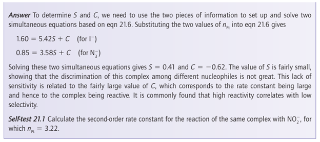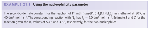 The nucleophilicity parameter is defined in terms of the reaction rates of a specific platinum complex. When the complex itself is varied we find that the reaction rates show a range of different sensitivities towards changes in the entering group. To express this range of sensitivities we rearrange eqn 21.4 into
