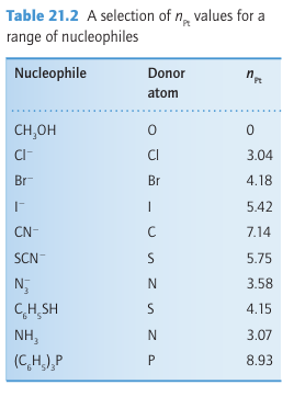And kr,2o is the rate constant for the same reaction with the reference nucleophile methanol. The entering group is highly nucleophilic, or has a high nucleophilicity, if nPt is large. Table 21.2 gives some values of nPt. One striking feature of the data is that, although the entering groups in the table are all quite simple, the rate constants span nearly nine orders of magnitude. Another feature is that the nucleophilicity of the entering group towards Pt appears to correlate with soft Lewis basicity (Section 4.12), with Cl<I-, O<S, and NH3<PR3.