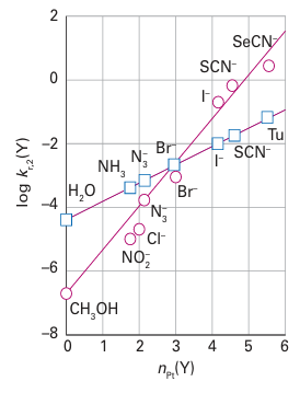 Figure 21.8 The slope of the straight line obtained by plotting log kr,2 (Y) against the nucleophilicity parameter nPt (Y) for a series of ligands is a measure of the responsiveness of the complex to the nucleophilicity of the entering group (data from U. Belluso, L. Cattaini, F. Basolo, R.G. Pearson, and A. Turco; J. Am. Chem. Soc., 1965, 87, 241).