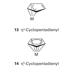 Key point: The naming of organometallic compounds is similar to the naming of coordination com pounds, but certain ligands have multiple bonding modes, which is reported as the hapticity. According to the recommended convention, we use the same system of nomenclature for organometallic compounds as set out for coordination complexes in Section 7.2. Thus, ligands are listed in alphabetical order followed by the name of the metal, all of which is written as one word. The name of the metal should be followed by its oxidation number in parentheses. The nomenclature used in research journals, however, does not always obey these rules, and it is common to find the name of the metal buried in the mid dle of the name of the compound and the oxidation number omitted. For example, (11) is sometimes referred to as benzene molybdenum-tricarbonyl, rather than the preferred name benzene(tricarbonyl)molybdenum (0). The IUPAC recommendation for the formula of an organometallic compound is to write it in the same form as for a coordination complex: the symbol for the metal is written first, followed by the ligands, listed in alphabetical order based on their chemical symbol. We shall follow these conventions unless a different order of ligands helps to clarify a particular point. Often a ligand with carbon donor atoms can exhibit multiple bonding modes—for instance, the cyclopentadienyl group can commonly bond to a d-metal atom in three different ways—thus, we need some additional nomenclature. Without going into the intimate details of the bonding of the various ligands (we do that later in this chapter), the extra information we need to describe a bonding mode is the number of points of attachment. This procedure gives rise to the notion of hapticity, the number of ligand atoms that are considered formally to be bonded to the metal atom. The hapticity is denoted ηn, where n is the number of atoms (and η is eta). For example, a CH3 group attached by a single MC bond is monohapto, η1, and if the two C atoms of an ethene ligand are both within bonding distance of the metal, the ligand is dihapto, η2. Thus, three cyclopentadienyl complexes might be described as having η1 (12), η3 (13), or η5 (14) cyclopentadienyl groups.