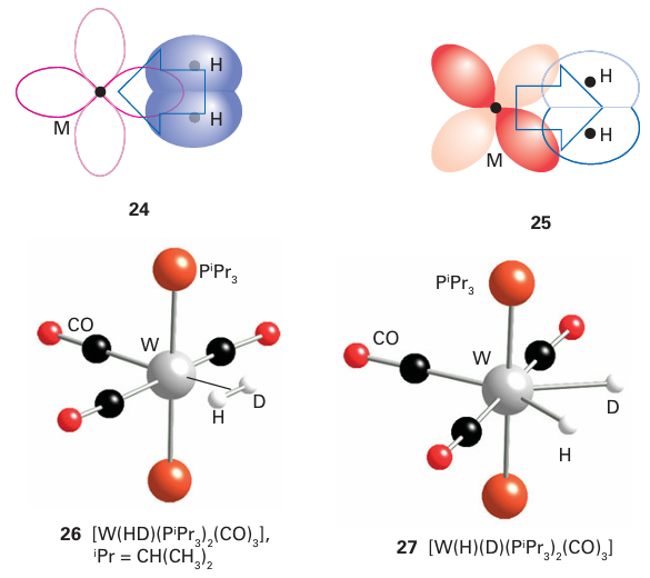 Bridging hydrides exist, where an H atom bridges either two or three metal atoms: here the bonding can be treated in exactly the same way we considered bridging hydrides in diborane, B2H6 (Section 2.11). Although the first organometallic metal hydride was reported in 1931, complexes of hydrogen gas, H2 , were identified only in 1984. In such compounds, the dihydrogen molecule, H2 , bonds side-on to the metal atom (in the older literature, such compounds were sometimes called non-classical hydrides). The bonding of dihydrogen to the metal atom is considered to be made up of two components: a σ donation of the two electrons in the H2 bond to the metal atom (24) and a π backdonation from the metal to the σ* antibonding orbital of H2 (25). This picture of the bonding raises a number of interesting issues. In particular, as the π backbonding from the metal atom increases, the strength of the HH bond decreases and the structure tends to that of a dihydride:
