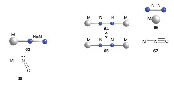 Key points: The bonding of dinitrogen to a metal atom is weak but contains both a σ-donating and a π-accepting component; nitrogen monoxide can bind to a metal in two different ways—either bent or straight. Neither dinitrogen, N2, nor nitrogen monoxide, NO, is strictly an organometallic ligand, although they are sometimes found in organometallic compounds. Dinitrogen is a much sought-after ligand as complexes can potentially take part in a catalytic reduction of nitro gen to more useful species. Dinitrogen can bind to metals in a number of different ways. The majority of complexes have a terminal monohapto link, η1-N2, in which the bonding can be considered to be like that of the isoelectronic CO ligand (63). Dinitrogen is both a weaker σ donor and a weaker π acceptor than CO, and hence is bound less strongly; in fact only good π-donor metal atoms bind N2. Like CO, the N2 ligand has a distinctive IR stretching band lying in the range 2150-1900 cm-1. A dinitrogen molecule can participate in two bonding interactions and bridge two metal atoms (64). If the backdonation to the nitrogen is extensive in this kind of complex, it can formally be considered to have been reduced to a hydrazine (65). Occasionally, dinitrogen ligands are found bound in a dihapto (η2) side-on fashion (66). In these complexes the ligand is best considered analogous to an η2-alkyne. The side-on bonding mode seems to be particularly common in complexes of the f metals (Chapter 23). Nitrogen monoxide (nitric oxide) is a radical with 11 valence electrons. When bound, NO is referred to as the nitrosyl ligand and can bond in one of two modes to d-metal atoms, in either a bent or a linear fashion. In the linear arrangement (67), the ligand is considered to be the NO cation. The NO cation is isoelectronic with CO, and the bonding can be considered in a similar fashion (a two-electron σ donor, with strong π-acceptor ability).