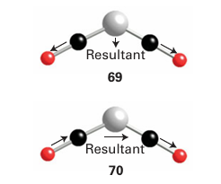 Infrared and 13C-NMR spectroscopy are widely used to determine the arrangement of atoms in metal carbonyl compounds, as separate signals are observed for inequivalent CO ligands. NMR spectra generally contain more detailed structural information than IR spec tra provided the molecule is not fluxional (the timescales of the NMR and IR transition are different, Sections 8.4, 8.5). However, IR spectra are often simpler to obtain, and are particularly useful for following reactions. Most CO stretching bands occur in the range 2100 1700 cm1, a region that is generally free of bands due to organic groups. Both the range of CO stretching frequencies (see Fig. 22.4) and the number of CO bands (Table 22.7) are important for making structural inferences. Group theory allows us to predict the number of active CO stretches in both the IR and Raman spectra (Section 6.5). If the CO ligands are not related by a centre of inversion or a threefold or higher axis of symmetry, a molecule with N CO ligands will have N CO stretching absorption bands. Thus, a bent OCMCO group (with only a twofold symmetry axis) will have two infrared absorptions because both the symmetric (69) and antisymmetric (70) stretches cause the electric dipole moment to change and are IR active. Highly symmetrical molecules have fewer bands than CO ligands. Thus, in a linear OC MCO group, only one IR band (corresponding to the out-of-phase stretching of the two CO ligands) is observed in the CO stretching region because the symmetrical stretch leaves the overall electric dipole moment unchanged. As shown in Fig. 22.12, the positions of the CO ligands in a metal carbonyl may be more symmetrical than the point group of the whole compound suggests and then fewer bands will be observed than are predicted on the basis of the overall point group. Raman spectroscopy can be very useful in assign ing structures because the selection rules complement those of IR (Sections 6.5 and 8.4). Thus, for a linear OCMCO group, the symmetrical stretching of the two CO ligands is observed in the Raman spectrum. As we noted in Section 22.5, infrared spectroscopy is also useful for distinguishing terminal CO (MCO) from bridging CO (μ2-CO) and face-bridging CO (μ3-CO). It can also be used to determine the order of π-acceptor strengths for the other ligands present in a complex. A motionally averaged NMR signal is observed when a molecule undergoes changes in structure more rapidly than the technique can resolve (Section 8.5). Although this phenomenon is quite common in the NMR spectra of organometallic compounds, it is not normally observed in their IR or Raman spectra. An example of this difference is Fe (CO)5,