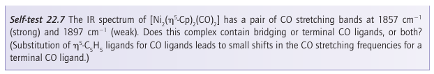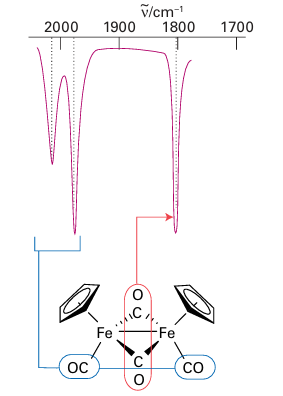 Figure 22.12 The infrared spectrum of [Fe2 (Cp)2(CO)4]. Note the two high-frequency terminal CO stretches and the lower frequency absorption of the bridging CO ligands. Although two bridging CO bands would be expected on account of the low symmetry of the complex, a single band is observed because the two bridging CO groups are nearly collinear.