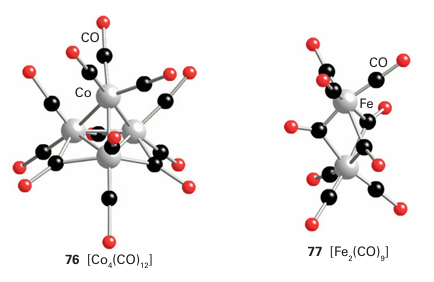 The distinction between cage and cluster compounds can seem arbitrary as the presence of bridging ligands in a cluster such as (76) raises the possibility that the atoms are held together by M L M interactions rather than MM bonds. Bond lengths are of some help in resolving this issue. If the MM distance is much greater than twice the metallic radius, then it is reasonable to conclude that the MM bond is either very weak or absent. However, if the metal atoms are within a reasonable bonding distance, the proportion of the bonding that is attribut able to direct MM interaction is ambiguous. For example, there has been much debate about the extent of Fe-Fe bonding in [Fe2 (CO)9] (77). Metal-metal bond strengths in metal complexes cannot be determined with great precision, but a variety of pieces of evidence—such as the stability of compounds and MM force constants—indicate that there is an increase in M-M bond strengths down a group in the d block. This trend contrasts with that in the p block, where element-element bonds are usually weaker for the heavier members of a group. As a consequence of this trend, metal-metal bonded systems are most numerous for the 4d- and 5d-series metals.