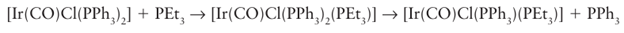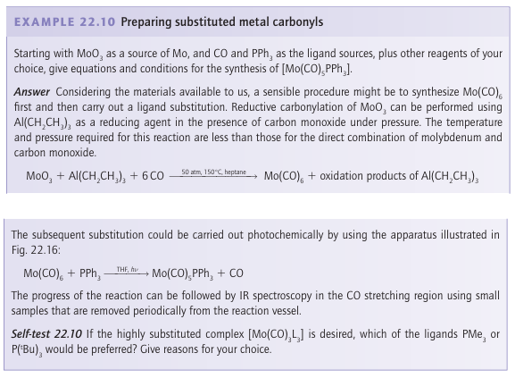 Whereas the loss of the first CO group from Ni(CO)4 occurs easily, and substitution is fast at room temperature, the CO ligands are much more tightly bound in the Group 6 carbonyls, and loss of CO often needs to be promoted thermally or photochemically. For example, the substitution of CO by CH3 CN is carried out in refluxing acetonitrile, using a stream of nitrogen to sweep away the carbon monoxide and hence drive the reaction to completion. To achieve photolysis, mononuclear carbonyls (which do not absorb strongly in the visible region) are exposed to near-UV radiation in an apparatus like that shown in Fig. 22.16. As with the thermal process, there is strong evidence that the photoassisted substitution reaction leads to the formation of a labile intermediate complex with the solvent, which is then displaced by the entering group. Solvated intermediates in the photolysis of metal carbonyls have been detected, not only in polar solvents such as THF but also in every solvent that has been tried, even in alkanes and noble gases.3 The rates of substitution of ligands in 16-electron complexes are sensitive to the identity and concentration of the entering group, which indicates associative activation. For exam ple, the reactions of [Ir (CO)Cl (PPh3)2] with triethyl phosphine are associatively activated: