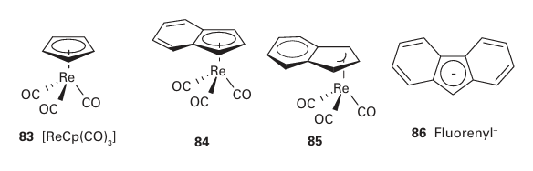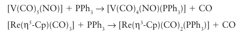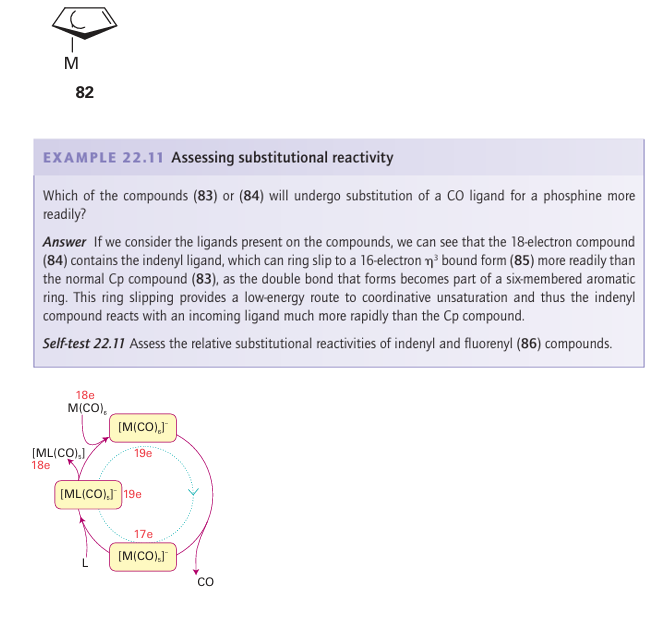 Although the generalizations above apply to a wide range of reactions, some exceptions are observed, especially if cyclopentadienyl or nitrosyl ligands are present. In these cases it is common to find evidence of associatively activated substitution even for 18-electron complexes. The common explanation is that NO may switch from being linear (as in 67) to being angular (as in 68), whereupon it donates two fewer electrons (Section 22.17). Similarly, the 5-Cp six-electron donor can slip relative to the metal and become an 3-Cp four-electron donor. In this case, the C5H5- ligand is regarded as having a three-carbon interaction with the metal while the remaining two electrons form a simple C=C bond that is not engaged with the metal (82), and the relatively electron-depleted central metal atom becomes susceptible to substitution: