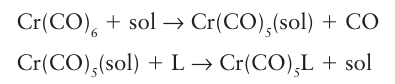 Extensive studies of CO substitution reactions of simple carbonyl complexes have revealed systematic trends in mechanisms and rates, and much that has been established for these compounds is applicable to all organometallic complexes. The simple replacement of one ligand by another in organometallic complexes is very similar to that observed with coordination compounds, where reactions sometimes go by an associative, a dissociative, or an interchange pathway, with the reaction being either associatively or dissociatively activated (Section 21.2). The simplest examples of substitution reactions involve the replacement of CO by another electron-pair donor, such as a phosphine. Studies of the rates at which trialkylphosphines and other ligands replace CO in Ni (CO)4, Fe (CO)5, and the hexacarbonyls of the chromium group show that they are relatively insensitive to the incoming group, indicating that a dissociatively activated mechanism is in operation. In some cases a solvated intermediate such as [Cr (CO)5(THF)] has been detected. This intermediate then combines with the entering group in a bimolecular process: