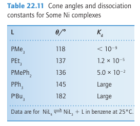 Sixteen-electron organometallic compounds appear to undergo associatively activated substitution reactions because the 18-electron activated complex is energetically more favour able than the 14-electron activated complex that would occur in dissociative activation. As in the reactions of coordination complexes, we can expect steric crowding between ligands to accelerate dissociative processes and to decrease the rates of associative processes (Section 21.6). The extent to which various ligands crowd each other is approximated by the Tolman cone angle and we can see how it influences the equilibrium constant for ligand binding by examining the dissociation constants of [Ni (PR3)4] complexes (Table 22.11). These complexes are slightly dissociated in solution if the phosphine ligands are compact, such as PMe3, with a cone angle of 118º. However, a complex such as [Ni (PtBu3)4], where the cone angle is huge (182º), is highly dissociated. The ligand PtBu3 is so bulky that the 14-electron complex [Pt (PtBu3)2] can be identified.