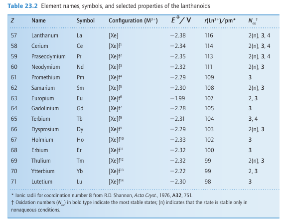 Key points: The lanthanoids are electropositive metals that commonly occur in their compounds as Ln (III); other oxidation states are stable only when an empty, half-filled, or full f subshell is produced. The elements La through to Lu are all highly electropositive, with standard potentials of the Ln3+ /Ln couple similar to that of Mg2+ /Mg (Table 23.2). They favour the oxidation state Ln (III) with a uniformity that is unprecedented in the periodic table. Other properties of the elements vary significantly. For example, the radii of the Ln3+ ions contract steadily from 116 pm for La3 to 98 pm for Lu3+. The decrease in ionic radius is attributed in part to the increase in the effective atomic number, Zeff, as electrons are added to the poorly shielding 4f subshell (Section 1.9), but detailed calculations indicate that subtle relativistic effects also make a substantial contribution. Figure 23.1 shows that the decrease in ionic radius corresponds to two gentle curves intersecting at Gd3 (f7). The effect is similar to that in the d block and can be traced to the splitting of the f-orbital energies by the crystal field generated by the ligand environment (Fig. 23.2), but the splitting is much smaller than in the d block. On the left of the series, the lower energy f orbitals (which point away from the ligands) are occupied as the number of f electrons increases (f1 to f4). For later configurations, such as f6 and f7, the higher energy