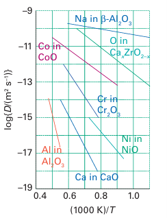 Figure 24.4 shows the temperature dependence of the diffusion coefficients, which are a measure of mobility, for specified ions in a selection of solids at high temperatures. The slopes of the lines are proportional to the activation energy for migration. Thus, Na is highly mobile and has a low activation energy for motion through -alumina, whereas Ca2 in CaO is much less mobile and has a high activation energy for hopping through the rock-salt structure.