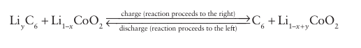 The battery is discharged through the reverse electrochemical reaction. Lithium cobalt oxide, which is used in many commercial lithium-ion batteries, has many of the characteristics required for this type of application. The specific energy (the stored energy divided by the mass) of LiCoO2 (140 W h kg 1) is maximized by using light elements such as Li and Co; the 3d metals are almost invariably used in such applications because they are the lowest density elements with variable oxidation states. The high mobility of the Li ion and good reversibility of electrochemical charging and discharging stem from the lithium ion’s small ionic radius and the layer-like structure of LiCoO2, which allows the Li to be extracted without major disruption of the structure. High capacities are obtained from the large amount of Li (one Li ion for each LiCoO2 formula unit) that may be reversibly extracted (about 500 discharge/recharge cycles) from the compound, and the current is delivered at a constant and high potential difference (of between 3.5 and 4 V). The high potential difference is partly due to the high oxidation states of cobalt (+3 and+4) that are involved. Because cobalt is expensive and fairly toxic, the search continues for even better oxide materials than LiCoO2 . New materials will be required to demonstrate the high levels of reversibility found for lithium cobaltite and considerable effort is being directed at doped forms of LiCoO2 and of LiMn2O4 spinels and at nanostructured complex oxides (Section 25.4), which, because of their small particle size, can offer excellent reversibility. There is also a high level of interest in LiFePO4, which shows good characteristics for a cathode material and contains cheap and nontoxic iron. The other electrode in a rechargeable lithium-ion battery can simply be Li metal, which completes the overall cell reaction through the process Li(s) → Li+ +e-. Lithium ions then migrate to the cathode through an electrolyte, which is typically an anhydrous lithium salt, such as LiPF4 or LiC (SO2CF3)3 dissolved in a polymer, such as poly (propene carbonate).