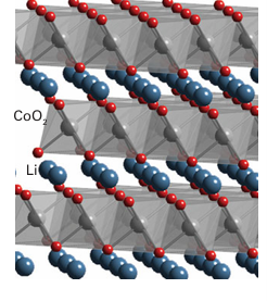 Figure 24.30 The structure of LiCoO2 shown as layers of linked CoO6 octahedra separated by Li ions; lithium may be de-intercalated electrochemically from between the layers. However, the use of Li metal has a number of problems associated with its reactivity and volume changes that occur in the cell. Therefore, an alternative anode material that is frequently used in rechargeable batteries is graphitic carbon, which can intercalate, electro chemically, large quantities of Li to form LiC6 (Section 14.5). As the cell is discharged, Li is transferred from between the carbon layers at the anode and intercalated into the metal oxide at the cathode (and vice versa on charging) with the following overall processes: