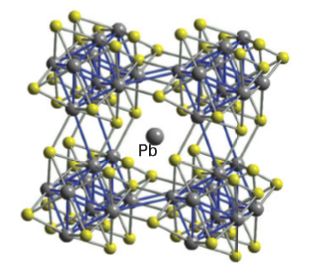 Figure 24.45 The structure of a Chevrel phase showing the canted Mo6S8 units forming a slightly distorted cube around a Pb atom. An Mo atom in one cube can act as the acceptor for an electron pair donated by an S atom in a neighbouring cage. Many other metal chalcogenide phases are being investigated for thermoelectric device applications. The compounds Bi2Te3 and Bi2Se3, in common with many metal chalcogenides, have layer-like structures similar to those of the MS2 phases described in Section 24.10b, and devices built on these materials can be designed to produce good electrical conductivity within the layers but poor thermal conductivity perpendicular to them, leading to useful thermoelectric efficiencies. Another important family of thermoelectric materials are the so-called ‘skutterudites’ (named after the mineral skutterudite, CoAs3) with the general formula Mx (Co, Fe, Ni) (P, As, Sb)3 with various inserted cations, M, such as Ln or Na, as in Na0.25FeSb3. The skutterudite structure is similar to that of ReO3 (Section 24.7) although the CoAs6 octahedra are tilted to produce some large cavities within the structure into which the cations may be inserted. These cations reduce the thermal conductivity of the structure by absorbing heat to rattle around within their cavities, while the high electronic conductivity of the (Co,Fe,Ni)(P,As,Sb)3 network is maintained.