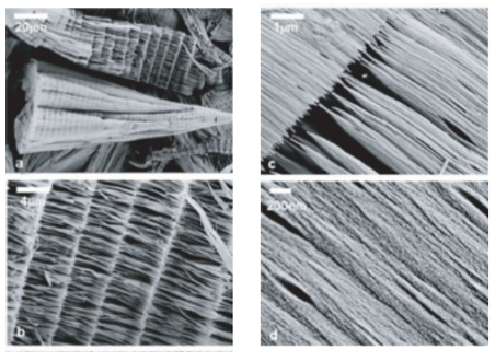 Figure 25.12 SEM illustrating the multiple levels of order in BaSO4 nanostructures controlled through morphosynthesis: (a) funnel-like structure with well-aligned cones; (b) magnified section showing the alignment in the superstructure; (c) magnified section showing the alignment of the nanostructured bundles; (d) magnified section showing the surface of the bundles. (Reproduced with permission from S.-H. Yu, et al., Nano Lett., 2003, 3, 379.)