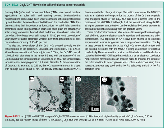 of the nanoparticles for solar cell and glucose sensor applications can be modified by changing the concentration of the copper(II) acac complexes that are used as templates for the growth of copper(I) sulfide nanoparticles on carbon nanotubes (Box 25.2).