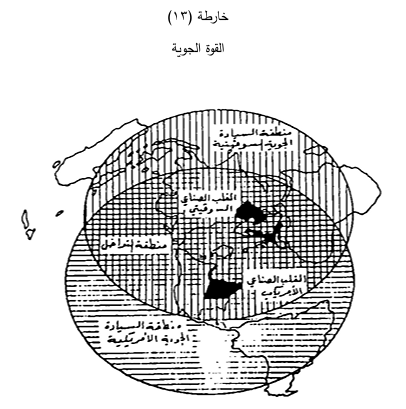 وقد حدد سفرسكي على هذه الخريطة دائرتين صغيرتين الأولى تمثل القلب الصناعي الروسي ، والثانية تمثل القلب الصناعي الأمريكي ، وأما الدائرتان الكبيرتان المتداخلتان فإن الأولى تحدد منطقة السيادة للقوة الجوية السوفيتية والتي تضم الجزء الأكبر من قارة أفريقيا وكل جنوب شرق آسيا وشمال أستراليا ، بينما تضم الدائرة الثانية منطقة سيادة القوة الجوية الأمريكية التي تمثل أمريكا الشمالية والجنوبية.