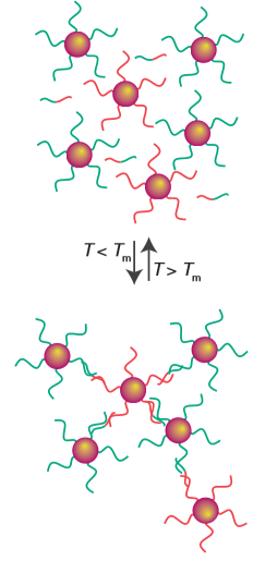 functionalized gold nanoparticle-DNA into a model system to study DNA condensation in vivo. These smart nanomaterials have far-reaching consequence for the design of nanoscale self-assembled materials that can be used as building blocks for active nanodevices. Another exciting accomplishment in the synthesis of bionanomaterials is the use of DNA to drive the assembly of inorganic nanoparticles (Fig. 25.38). First, nanoparticles are functionalized with single strands of DNA. Then, the complementary strand of DNA is introduced from an analyte or bioagent, leading to dimerization with the DNA on the nanoparticles and the self-assembly of the nanoparticles into ordered arrays. Detectable differencesin optical properties occur between the disordered and ordered states and result in colour changes. This work has helped to make sophisticated optical-based biosensor arrays with remarkable sensitivity and selectivity for different analytes and bioagents.