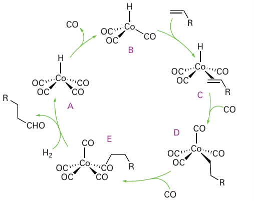 Key point: The mechanism of hydrocarbonylation is thought to involve a pre-equilibrium in which octa carbonyldicobalt combines with hydrogen at high pressure to give a monometallic species that brings about the actual hydrocarbonylation reaction. In a hydroformylation reaction, an alkene, CO, and H2 react to form an aldehyde containing one more C atom than in the original alkene: