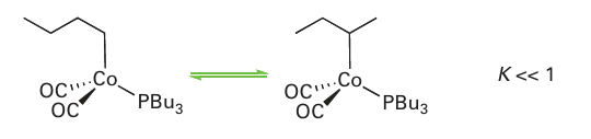 It is thought that [Co (CO)3H] then coordinates an alkene, producing (C) in Fig. 26.7, whereupon the coordinated hydrido ligand migrates onto the alkene, and CO recoordi nates. The product at this stage is a normal alkyl complex (D). In the presence of CO at high pressure, (D) undergoes migratory insertion and coordinates another CO, yielding the acyl complex (E), which has been observed by IR spectroscopy under catalytic reaction conditions. The formation of the aldehyde product is thought to occur by attack of either H2 (as depicted in Fig. 26.7) or the strongly acidic complex [Co (CO)4H] to yield an aldehyde and generate [Co (CO)4H] or [Co2(CO)8], respectively. Either of these complexes will regenerate the coordinatively unsaturated [Co (CO)3H]. A significant portion of branched aldehyde is also formed in the cobalt-catalysed hydroformylation. This product may result from a 2-alkylcobalt intermediate formed when reaction of (C) leads to an isomer of (D), with hydrogenation then yielding a branched aldehyde as set out in Fig. 26.8. When the linear aldehyde is required, such as for the syn thesis of biodegradable detergents, the isomerization can be suppressed by the addition of an alkylphosphine to the reaction mixture. One plausible explanation is that the replace ment of CO by a bulky ligand disfavours the formation of complexes of sterically crowded 2-alkenes: