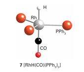 Here again we see an example of the powerful influence of ancillary ligands on catalysis. Another effective hydroformylation catalyst precursor is [Rh (CO)H(PPh3)3] (7), which loses a phosphine ligand to form the coordinatively unsaturated 16-electron complex [Rh (CO)H (PPh3 )2], which promotes hydroformylation at moderate temperatures and 1 atm. This behaviour contrasts with the cobalt carbonyl catalyst, which typically requires 150ºC and 250 atm. The rhodium catalyst is useful in the laboratory as it is effective under convenient conditions. Because it favours linear aldehyde products, it competes with the phosphine-modified cobalt catalyst in industry.